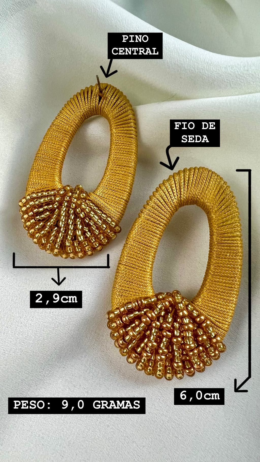 O Brinco é uma peça toda feita a mão. Possui base em resina encapada duplamente com fio de seda dourado. Acabamento em miçanga jablonex dourada espelhada e dourada lisa. Não é um brinco pesado, tem apenas 9gr. É super confortável na orelha, o seu pino que vai no furo da orelha é central, o que ajuda ainda mais a não dar aquela sensação de peso. Além disso sua tarracha é grande, o que também faz seu uso ser ainda mais confortável.