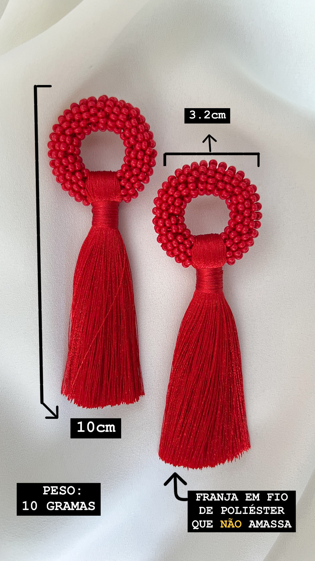O Brinco é uma peça toda feita a mão. Sua base redonda é em resina encapada com fio da mesma cor do brinco. Acabamento em miçanga jablonex 0,9mm vermelha. A franja é feita em fio acetinado de poliéster que NÃO amassa na cor vermelha. Não é um brinco pesado, tem apenas 10gr. É super confortável na orelha, o seu pino que vai no furo da orelha é central, o que ajuda ainda mais a não dar aquela sensação de peso. Além disso sua tarracha é grande, o que também faz seu uso ser ainda mais confortável.